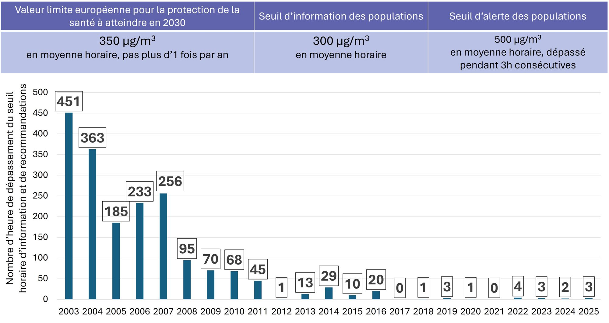 Les dépassements horaires des concentrations en dioxyde de soufre ont fortement diminué depuis les années 2000, et sont désormais quasiment nuls.