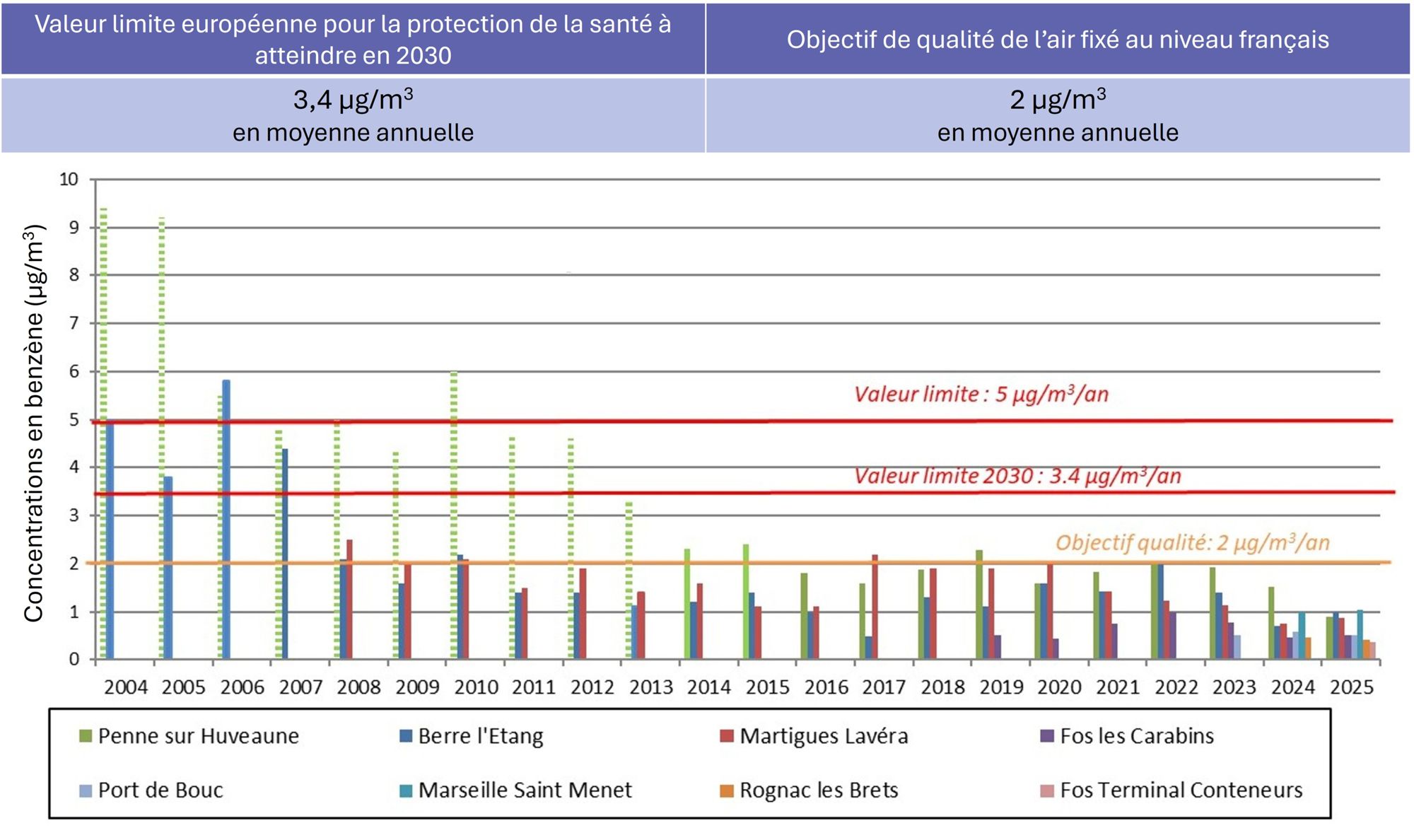 Les concentrations en benzène ont diminué depuis les années 2000. Elles se situent en dessous de la valeur limite pour la protection de la santé depuis de nombreuses années, et en dessous de l’objectif de qualité fixé au niveau français depuis 2020.